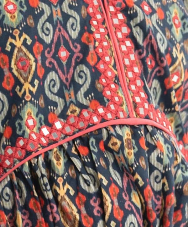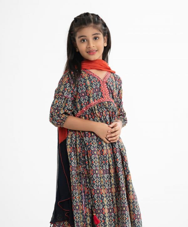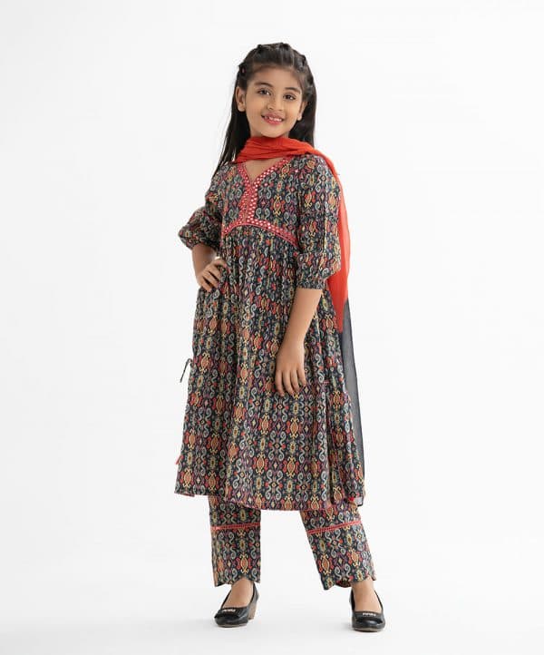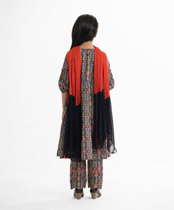 Kid girls printed tent-style salwar kameez in cotton fabric. V-neck and three-quarter sleeves. Embroidery at the front and gathered at the waistline. Side slits with tassel tie. Complemented with pant and tie-dye dupatta.