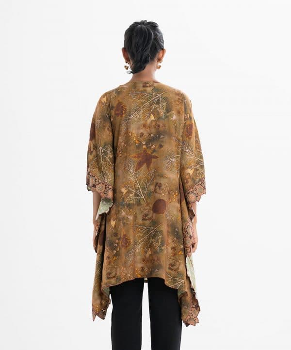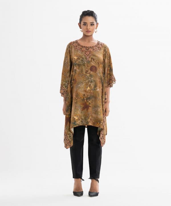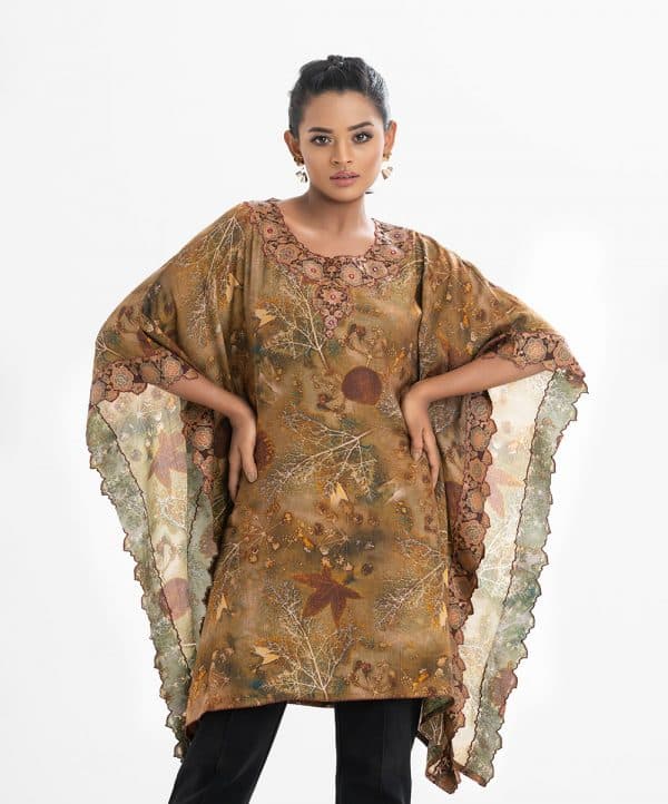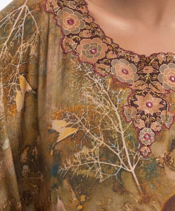 Printed abaya-style kaftan in blended cotton fabric. Cutwork with karchupi neckline and side border cutwork.