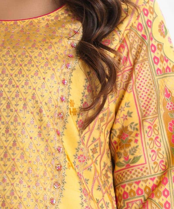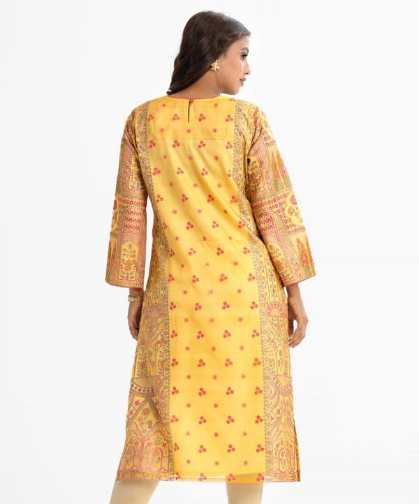 Exclusive printed straight kameez in Mosline from Nargisus by Le Reve. Round neck, three-quarter sleeved. Karchupi at the front and crepe inner.