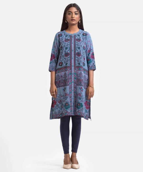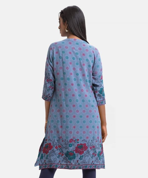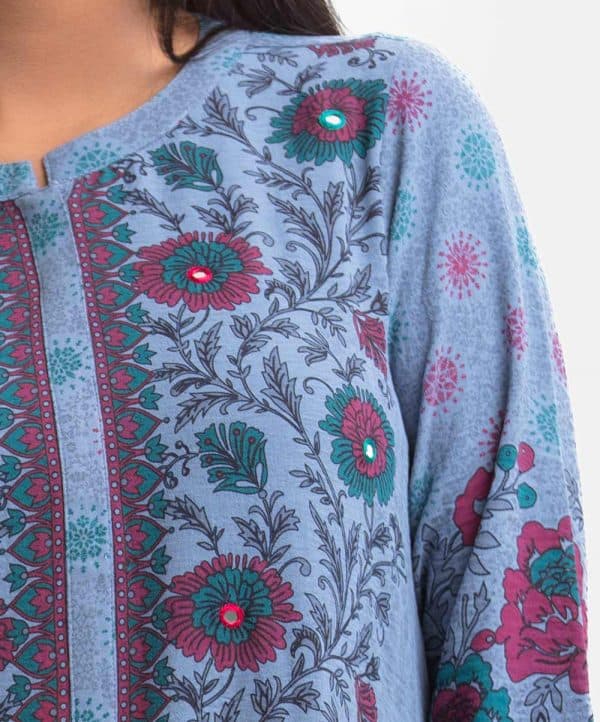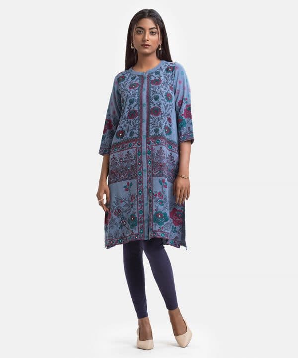 Woman’s floral printed A-line tunic in stretchable georgette fabric. Stand collar, three-quarter sleeves. Karchupi at front and inseam pockets.