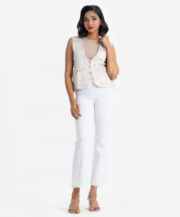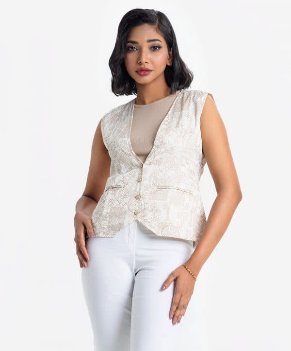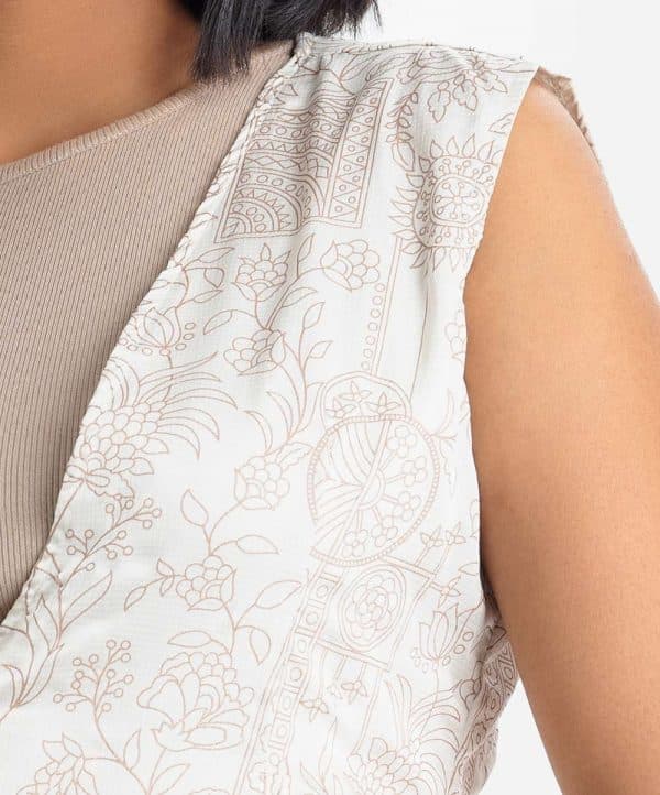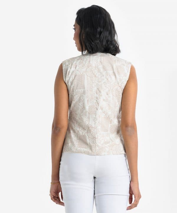 Women’s printed koti in crepe fabric. V-neck, sleeveless. Buttons fasting and two jetted pockets at the front.