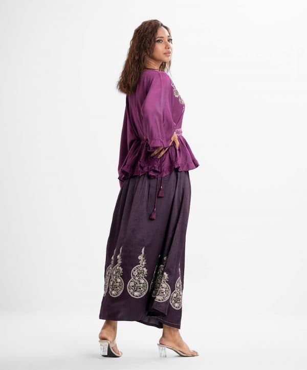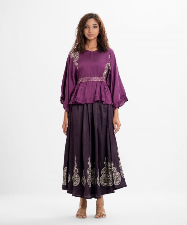 Women’s skirt top set in crepe fabric. V-neck with kimono sleeves, embroidery at front of the top. Concealed elasticated waist and embroidery work detail skirt.