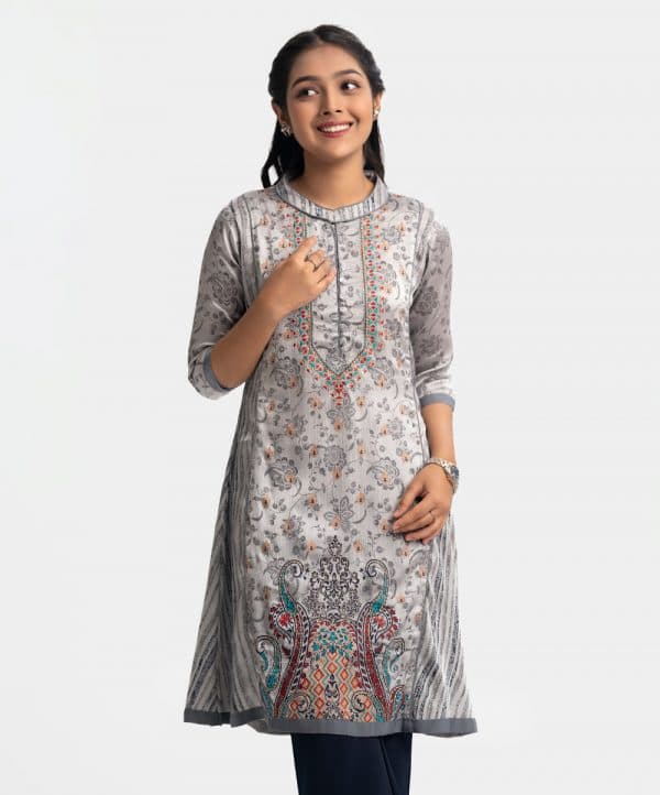 Teen girls printed A-line kameez in textured georgette fabric. Mandarin collar with design buttons placket, three-quarter sleeves. Embroidery at front.