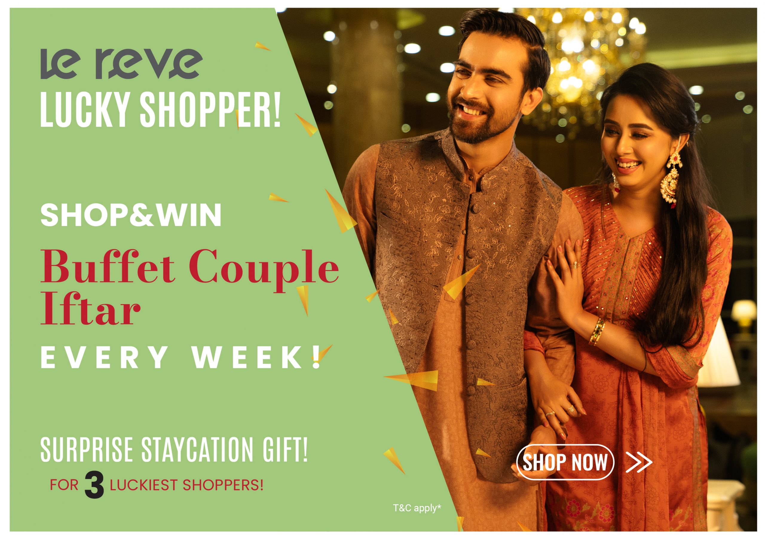 Le Reve is excited to elevate your Eid shopping experience with our “Lucky Shopper” campaign! Each week, one lucky shopper will be selected from our stores to win a buffet couple iftar at Hotel Regency. At the end of the campaign, three winners will receive an exclusive staycation offer.