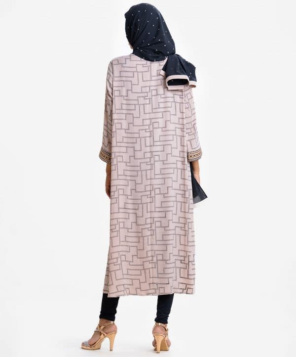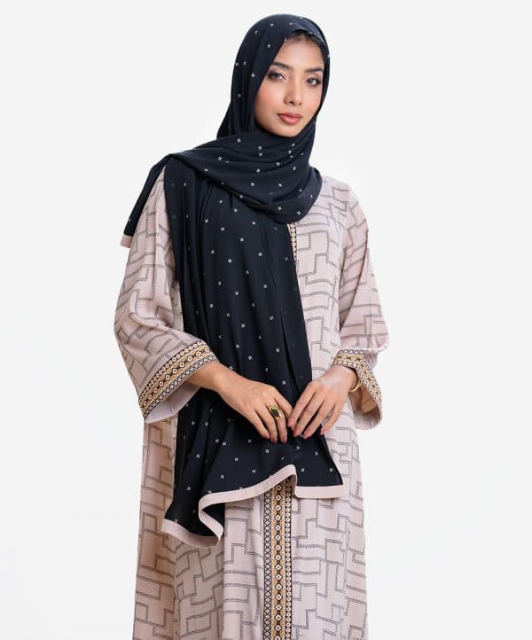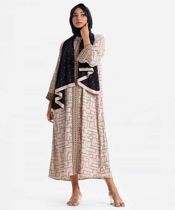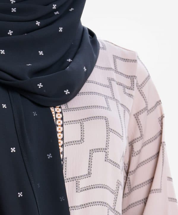 Women’s geometric printed abaya with hijab set in zoom fabric. Stand collar, full sleeves. Embroidery patch at front and sleeves hem.