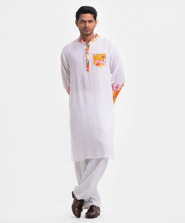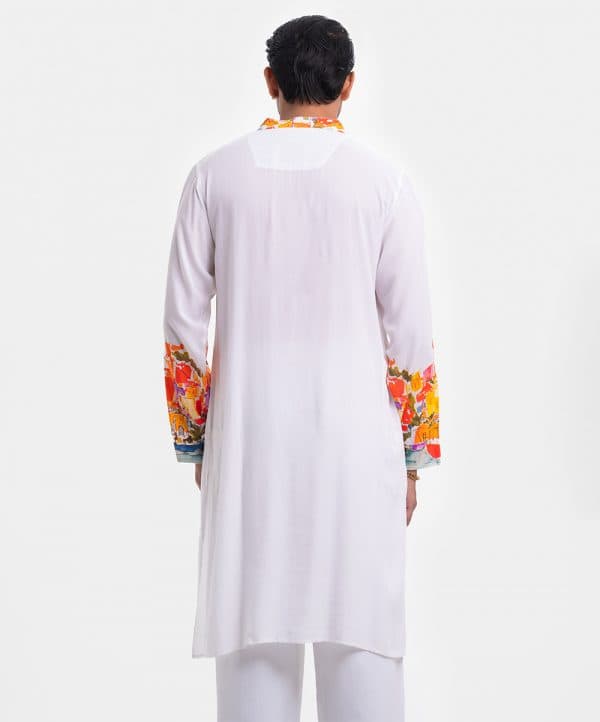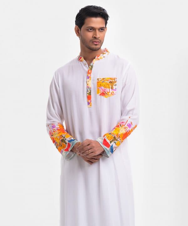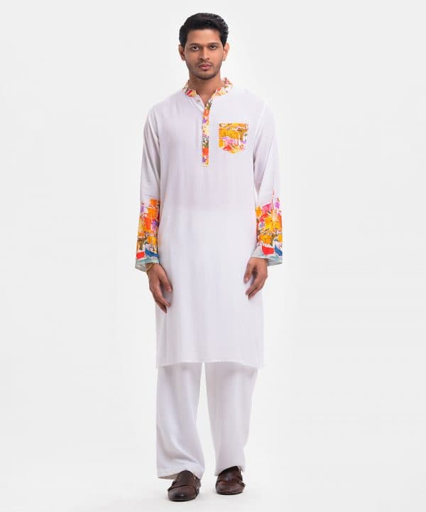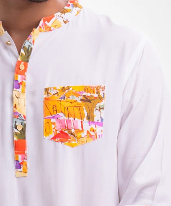 Men’s semi-fitted panjabi in viscose fabric. Print detail at the mandarin collar, placket, front pocket and sleeves. Inseam side pockets.
