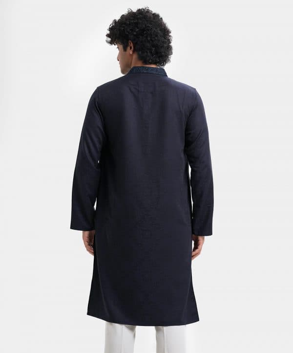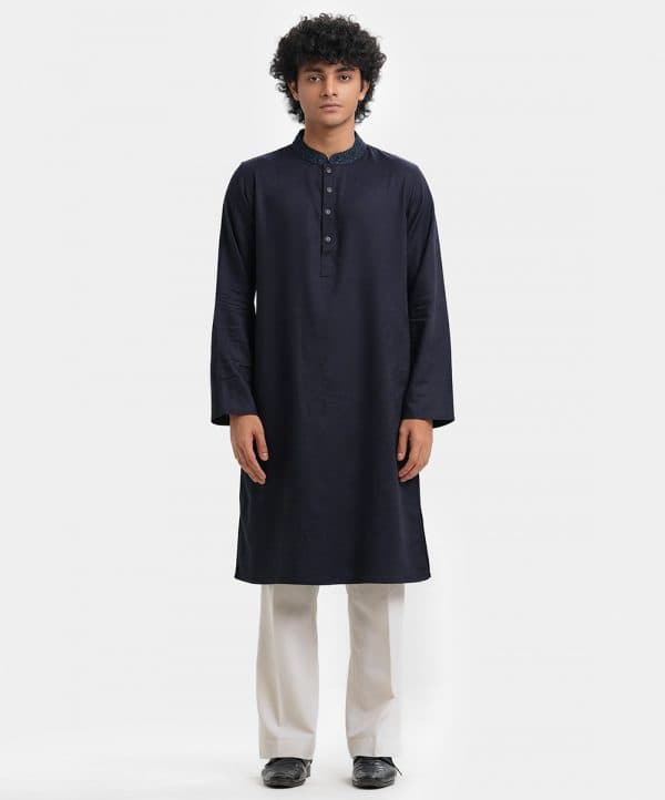 Men’s semi fitted panjabi in jacquard fabric. Karchupi at mandarin collar with metal buttons on the placket & full sleeves. Inseam pockets.