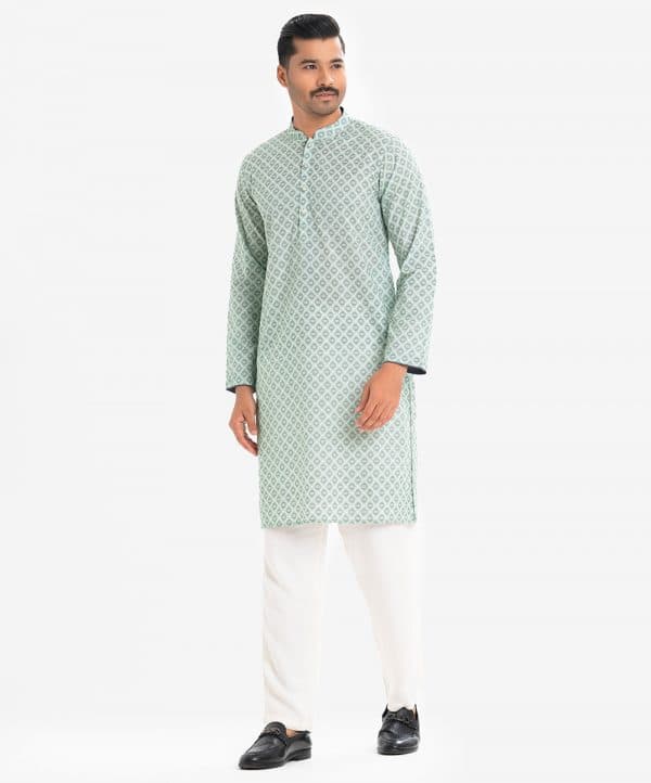 Mens printed semi-fitted panjabi in cotton fabric. Mandarin collar, inseam pockets and long sleeves.