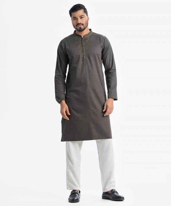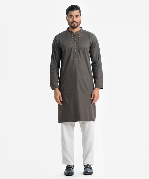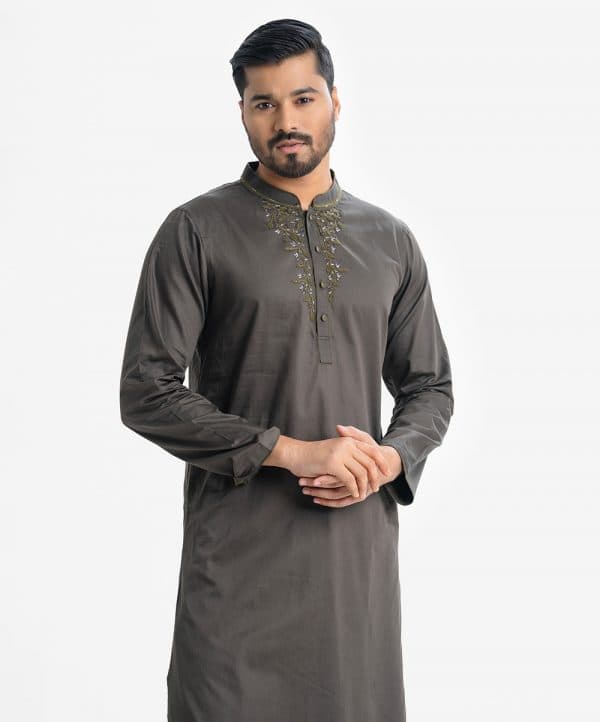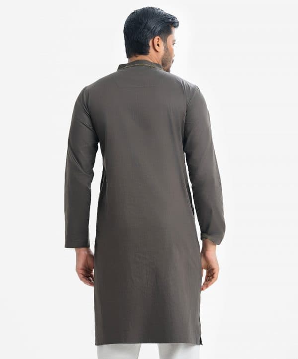 Men’s slim semi fitted Panjabi in cotton fabric. Mandarin collar, inseam pockets and long sleeves. Karchupi at the collar and placket.
