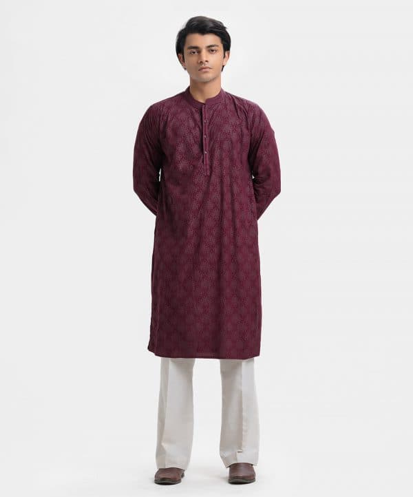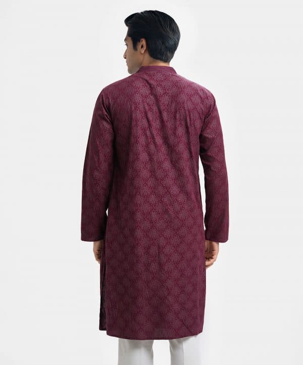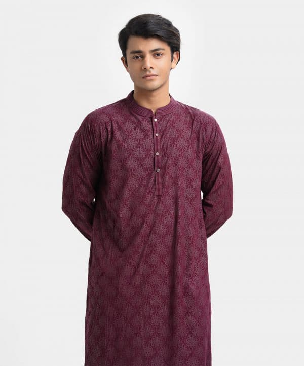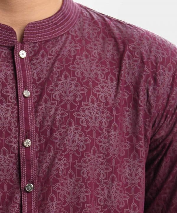 Men’s semi-fitted printed panjabi in viscose fabric. Line stitching at the mandarin collar & placket. Full sleeves and inseam pockets.