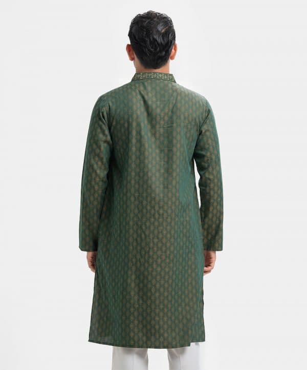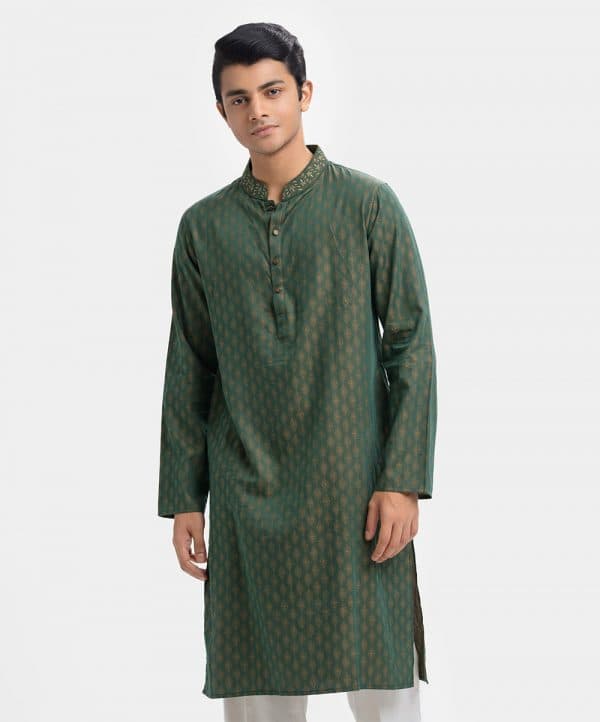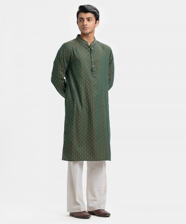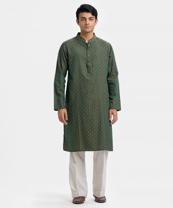 Men’s semi fitted panjabi in cotton jacquard fabric. Embroidered mandarin collar with metal buttons on the placket & full sleeves.