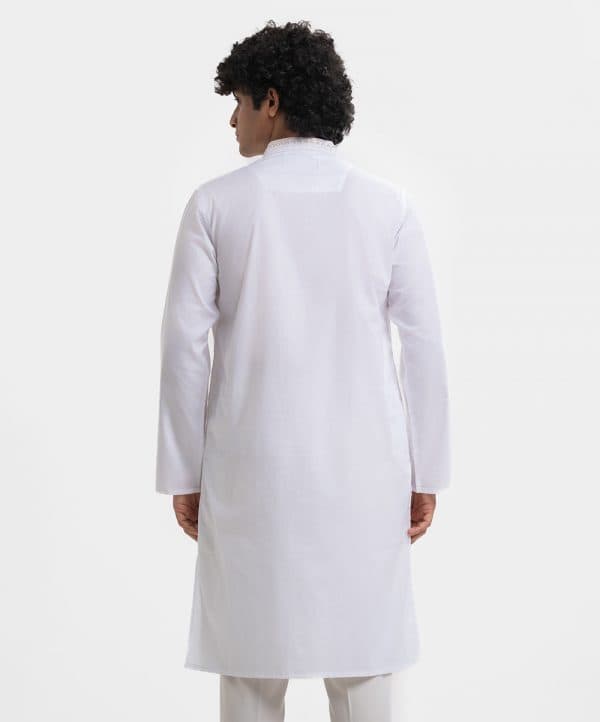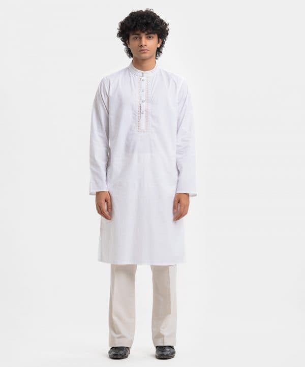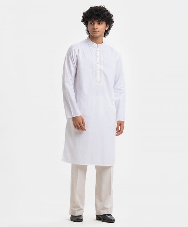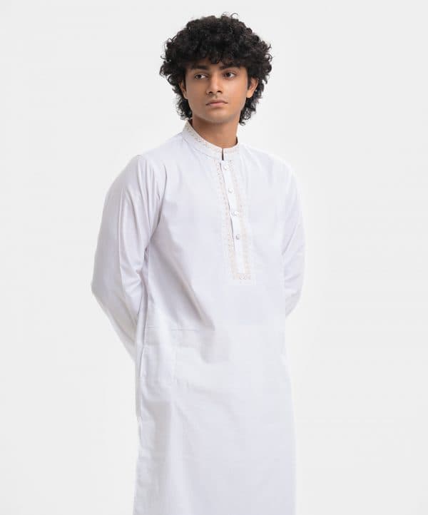 Men’s semi-fitted panjabi in cotton fabric. Mandarin collar, inseam pockets and long sleeves. Embroidery at the collar and placket.