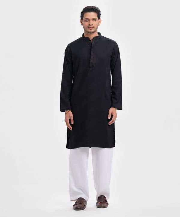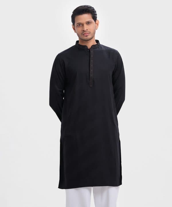 Men’s semi fitted panjabi in jacquard fabric. Embroidery at mandarin collar with metal buttons on the placket & full sleeves. Inseam pockets.