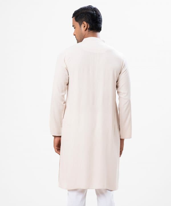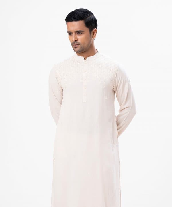 Men’s fitted panjabi in slab cotton fabric. Mandarin collar and embroidery at front.