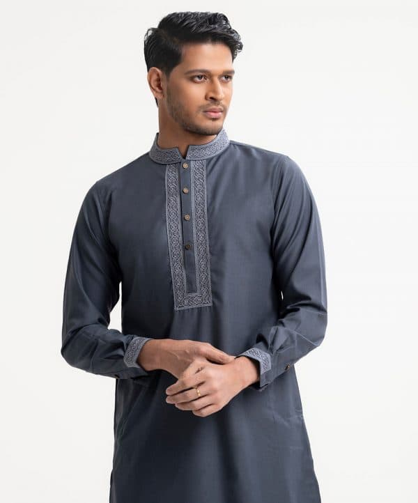 Men’s slim-fitted panjabi in cotton fabric. Mandarin collar, inseam pockets and long sleeves. Embroidery at the collar and placket.