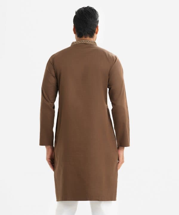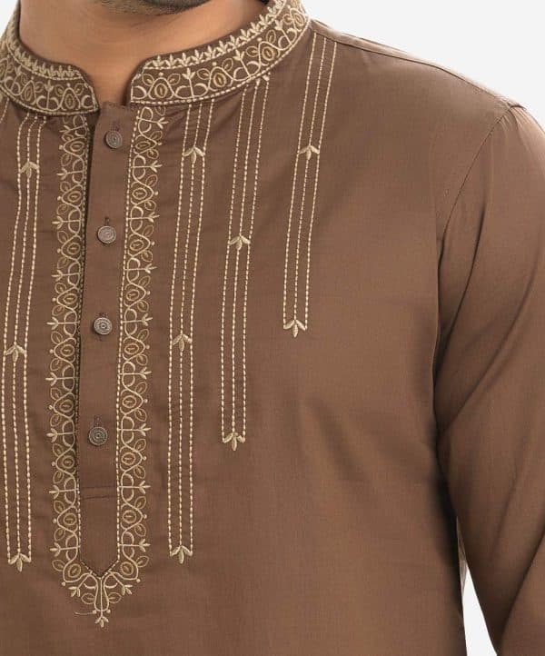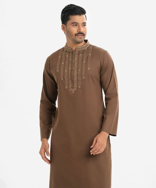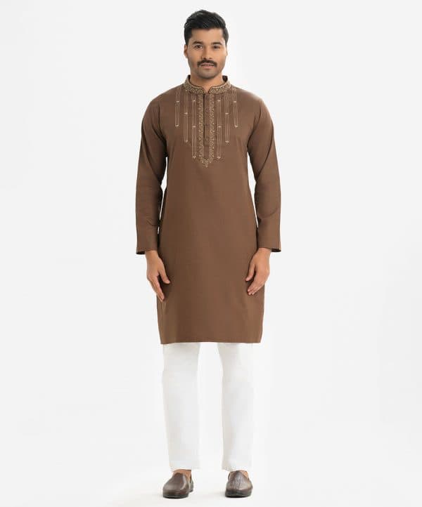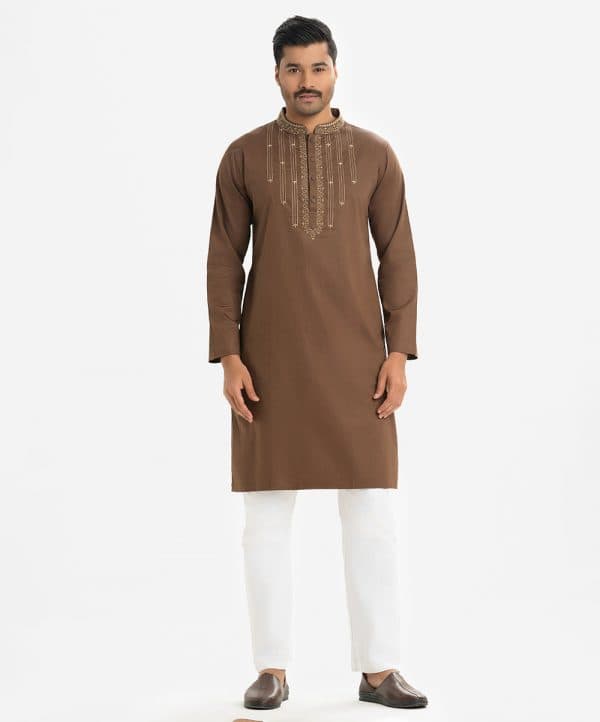Men’s fitted cotton panjabi featuring long sleeves, inseam side pockets, and embroidery at the chest and collar. Front button closure.