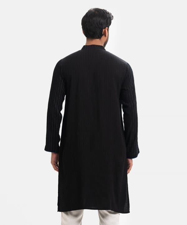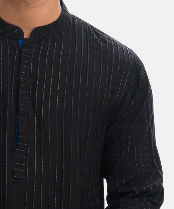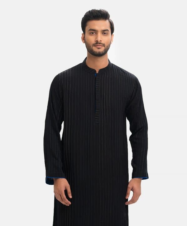 Men’s slim-fitted panjabi in cotton fabric. Mandarin collar, inseam pockets, and long sleeves. All-over pin tuck with line stitching.
