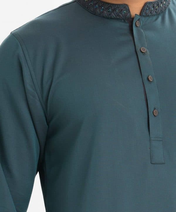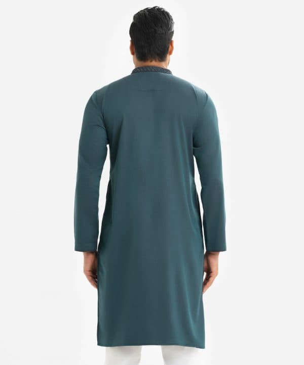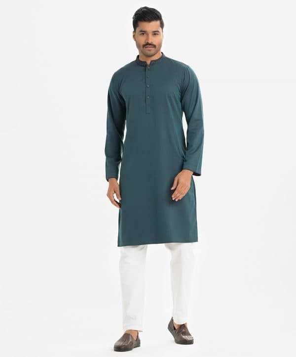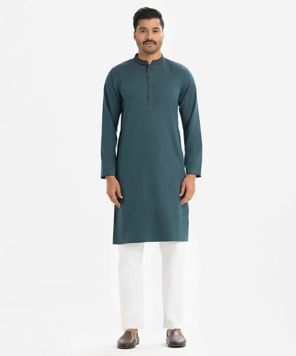Men’s slim-fitted panjabi in blended fabric. Mandarin collar with karchupi, inseam pockets and long sleeves.