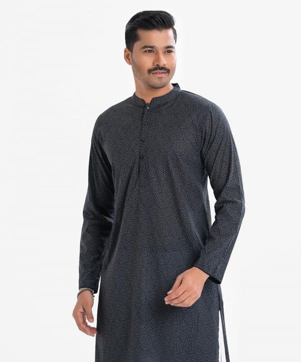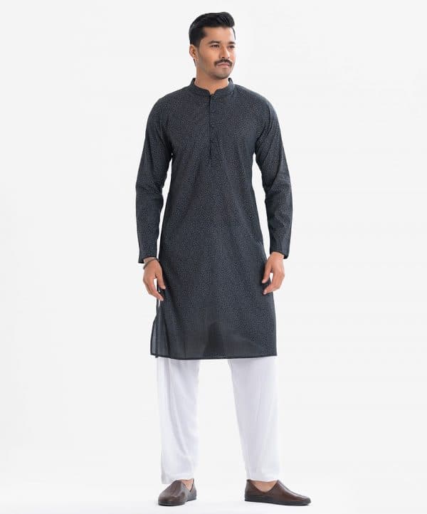 Men’s slim fitted Panjabi in cotton fabric. Mandarin collar, inseam pockets and long sleeves. Embroidery and karchupi at the front.