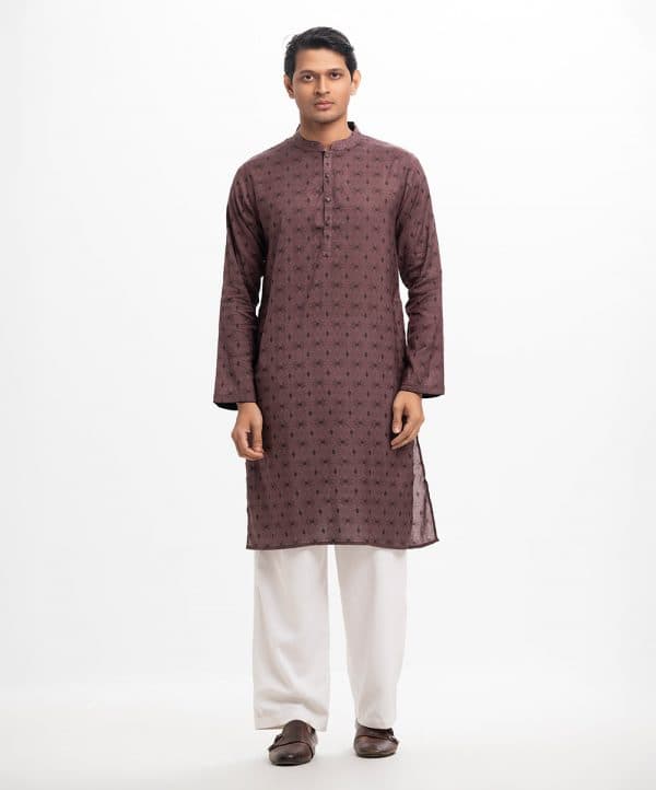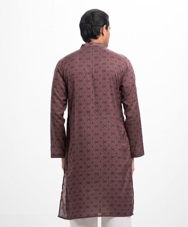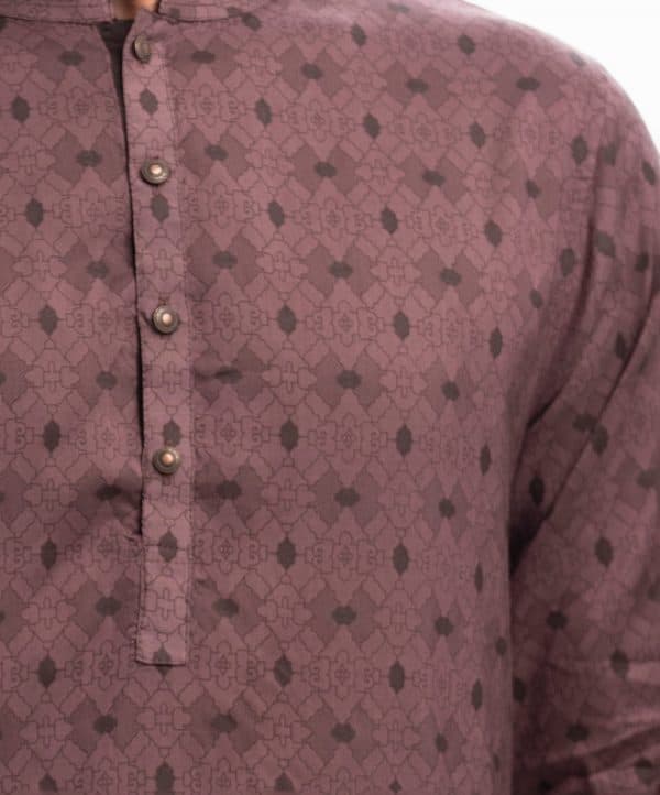 Men’s printed fitted panjabi in cotton fabric. Mandarin collar, buttons placket & full sleeves. Inseam pockets.