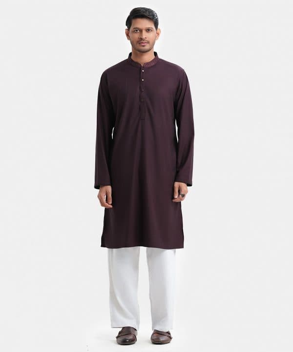 Men’s slim fitted panjabi in jacquard fabric. Karchupi at mandarin collar with metal buttons on the placket & full sleeves. Inseam pockets.