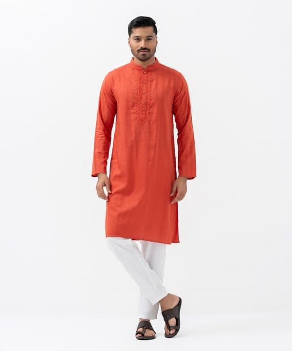Men’s fitted panjabi in jacquard fabric. Mandarin collar with metal buttons on the placket & full sleeves. Inseam pockets. Embroidery at front.