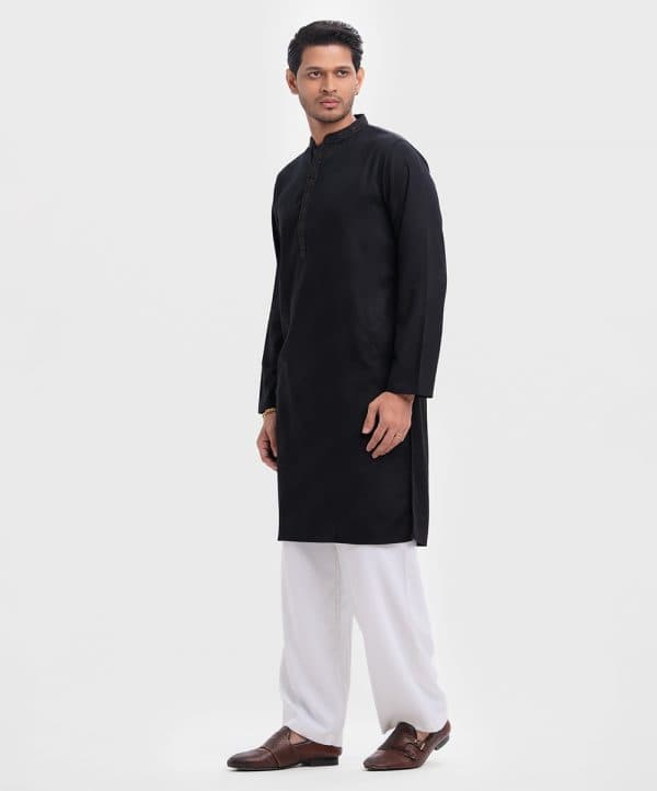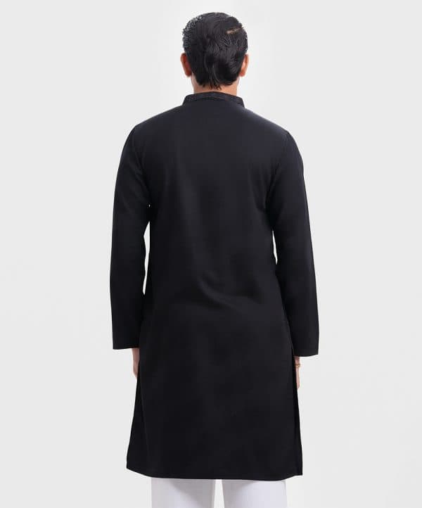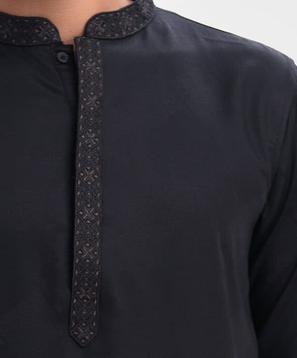 Men’s slim fitted panjabi in jacquard fabric. Embroidery at mandarin collar with metal buttons on the placket & full sleeves. Inseam pockets.