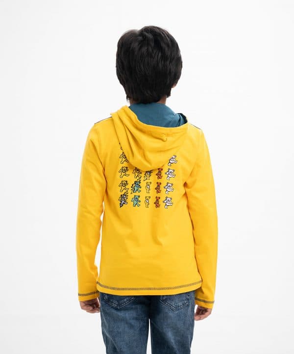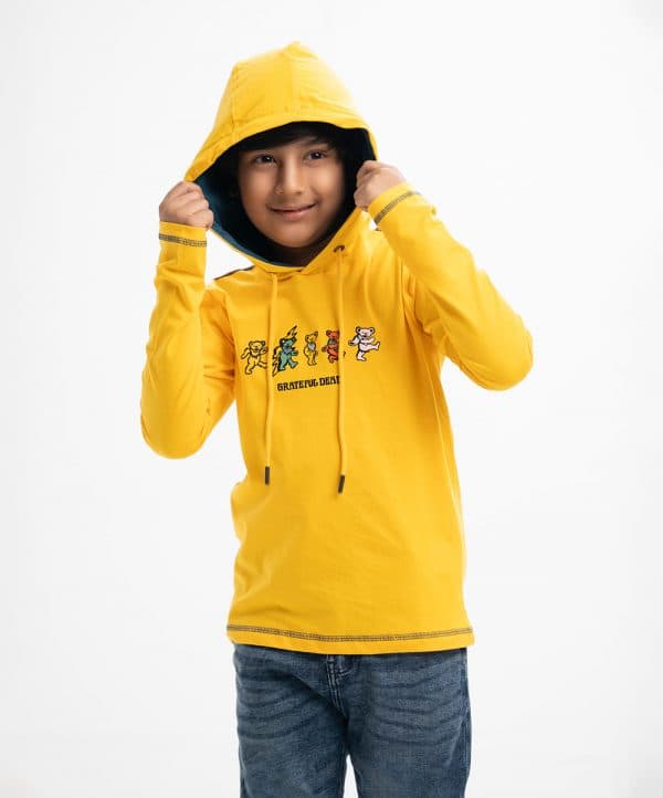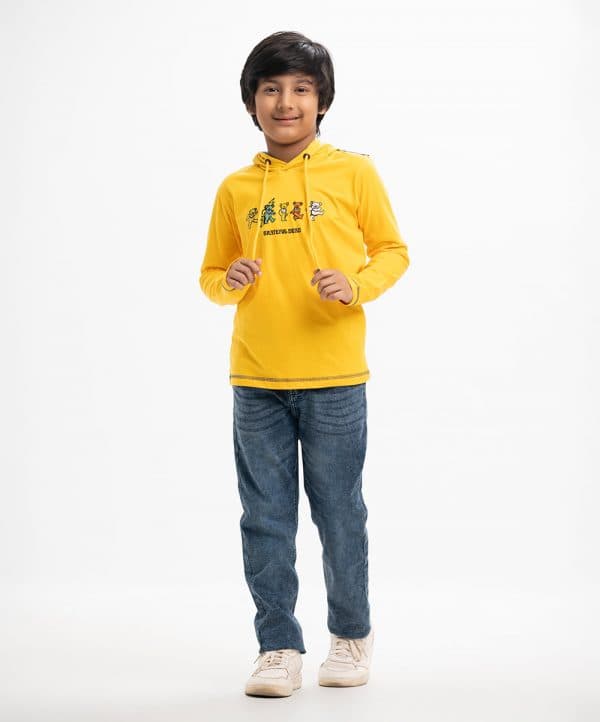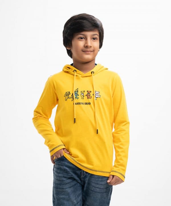 Kid boys long-sleeved hoddie T-shirt in cotton single jersey fabric. Cartoon print at the front and matching twill tape on the shoulders.