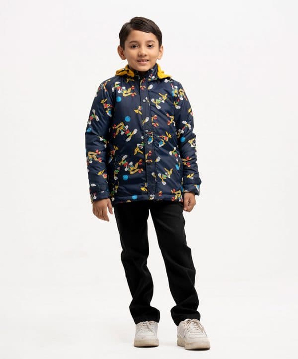 Kid boys cartoon printed jacket in taffeta fabric. Funnel neck with the terry fabric hoodie and drawstring cord. Hidden zipper opening with buttons fastening and two kangaroo pockets.