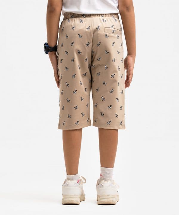 Kid boys printed three-quarter pant in cotton knit single jersey fabric. Concealed elasticated on the waistline with two side pockets and one patch pocket.