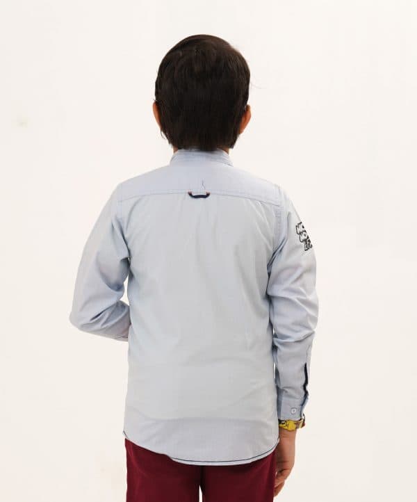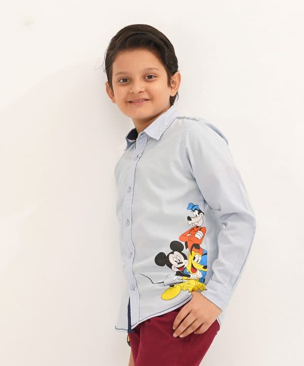 Cotton casual shirt in sky blue color and micky mouse print on the front. Comes with contrast inner collar band and contrast chain stitch on shoulder and bottom hem.