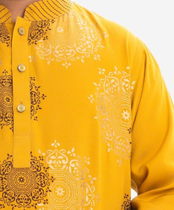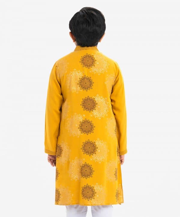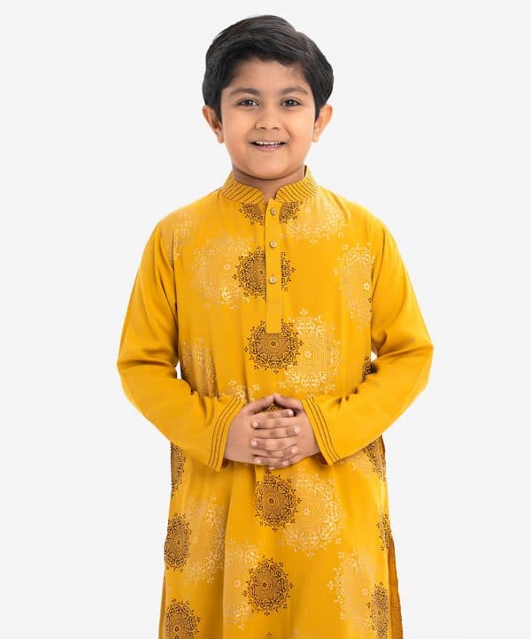 Kid boys mandala printed panjabi in viscose fabric. Line stitching at the mandarin collar and the full sleeves hem. Inseam pockets.