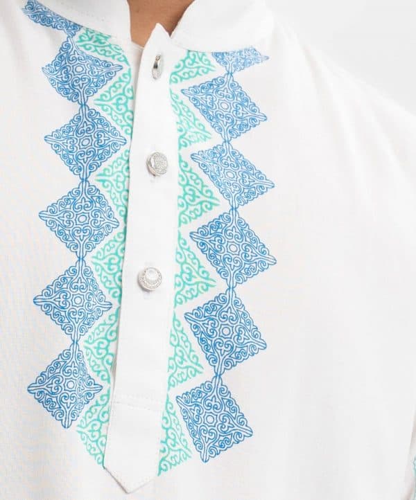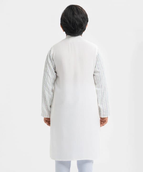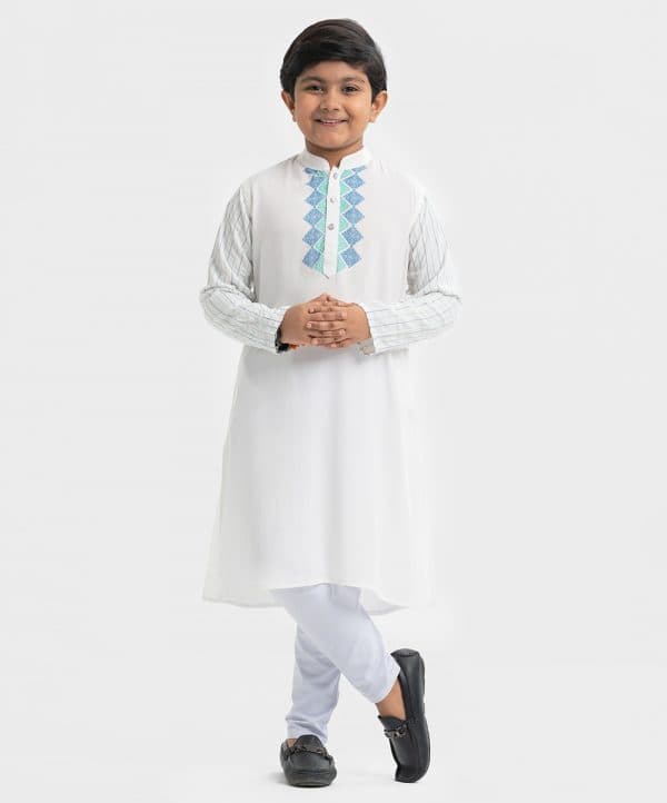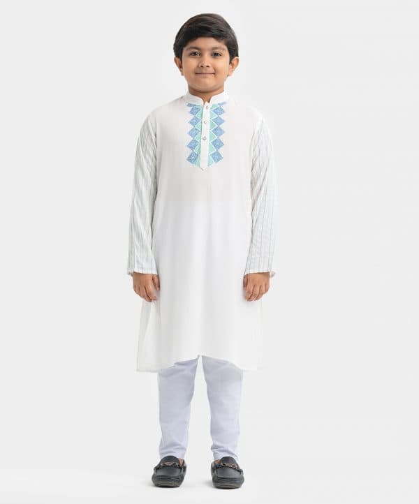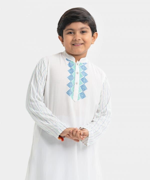 Kid boys panjabi in viscose fabric. Mandarin collar, print detail at placket side and line stitching at full sleeves. Inseam pockets.