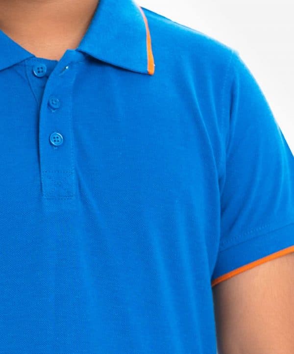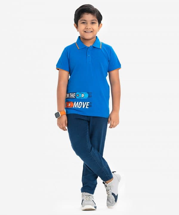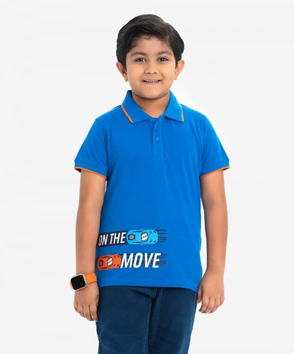 Kid boy’s solid color short-sleeved polo in cotton pique fabric. Classic collar and typography print on one side below
