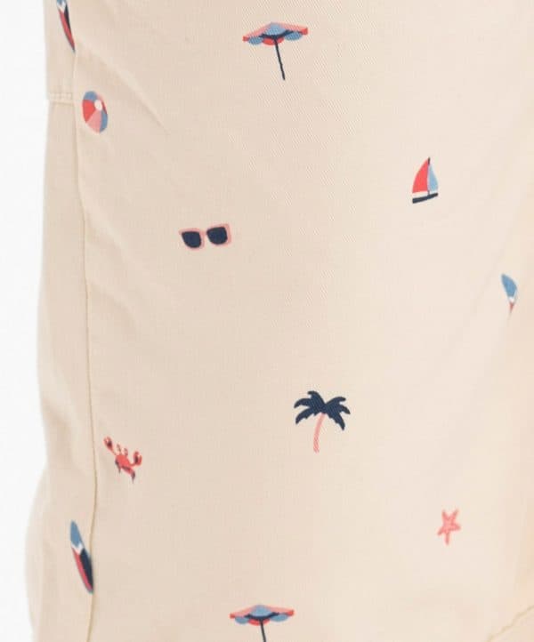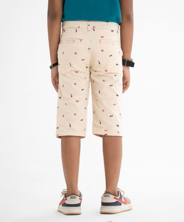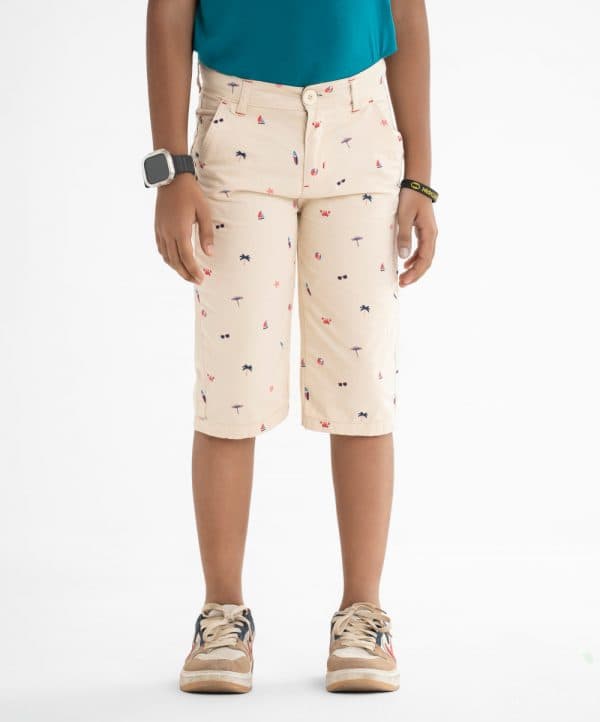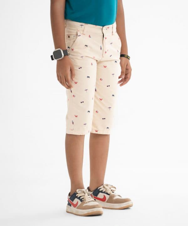 Kid boys printed three-quarter pant in cotton fabric. Zipper fly and a button fastening at the front. Two side pockets and two patch pockets on the back.