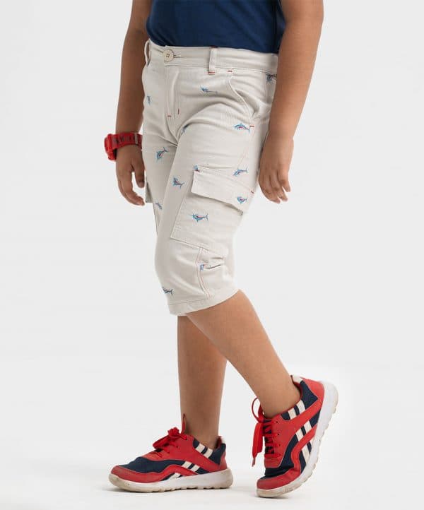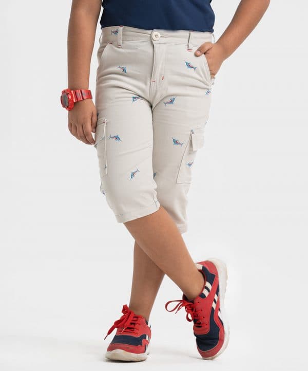 Kid boys’ printed three-quarter pant in blended cotton fabric. Zipper fly and a button fastening at the front. Two side pockets and two patch pockets on the back.