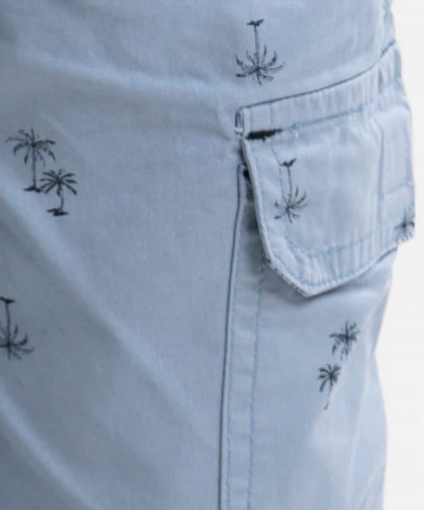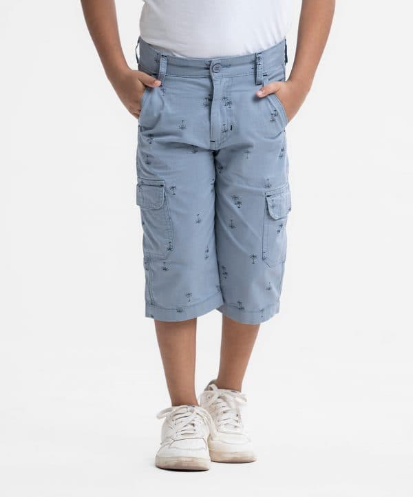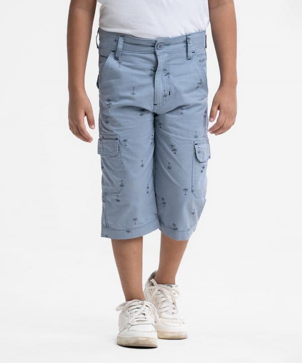 Kid boys’ printed three-quarter pant in twill fabric. Zipperfly and a button fastening at the front. Two side pockets and two patch pockets on the back.