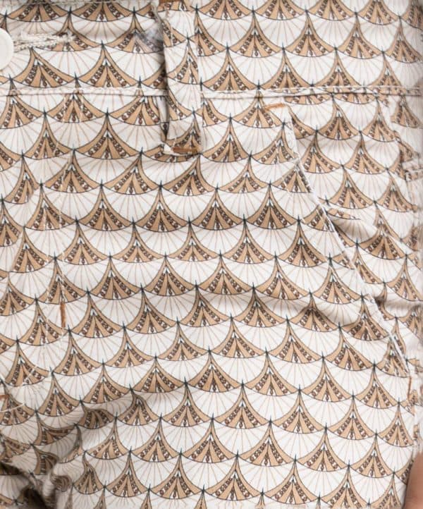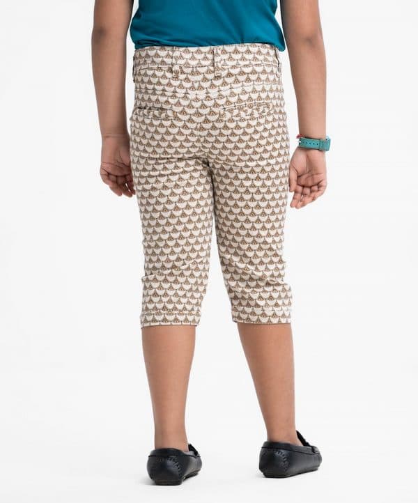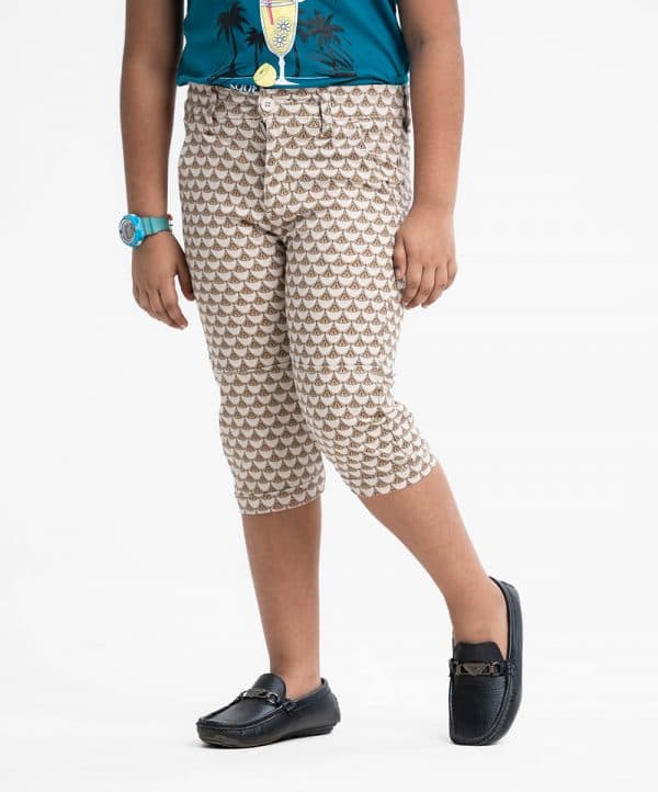 Kid boys’ printed three-quarter pant in blended cotton fabric. Zipper-fly and a button fastening at the front. Two side pockets and two patch pockets on the back.