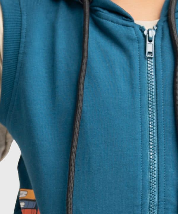 Sleeveless sweatshirt in French terry knit fabric. Hooded with an adjustable drawstring. Zipper closing with kangaroo pockets at the front.