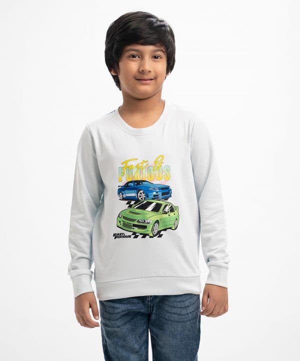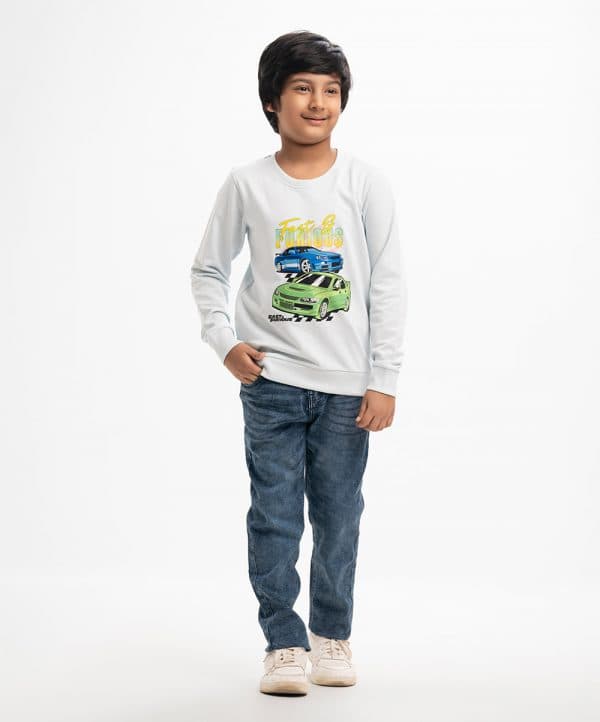 Round neck full-sleeved Sweatshirt in French terry knit fabric. Ribbed on the collar and cuffs, printed on the chest.