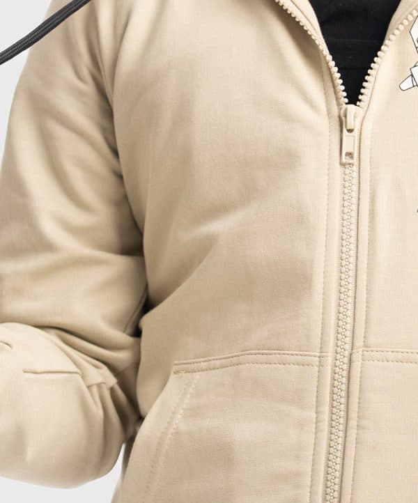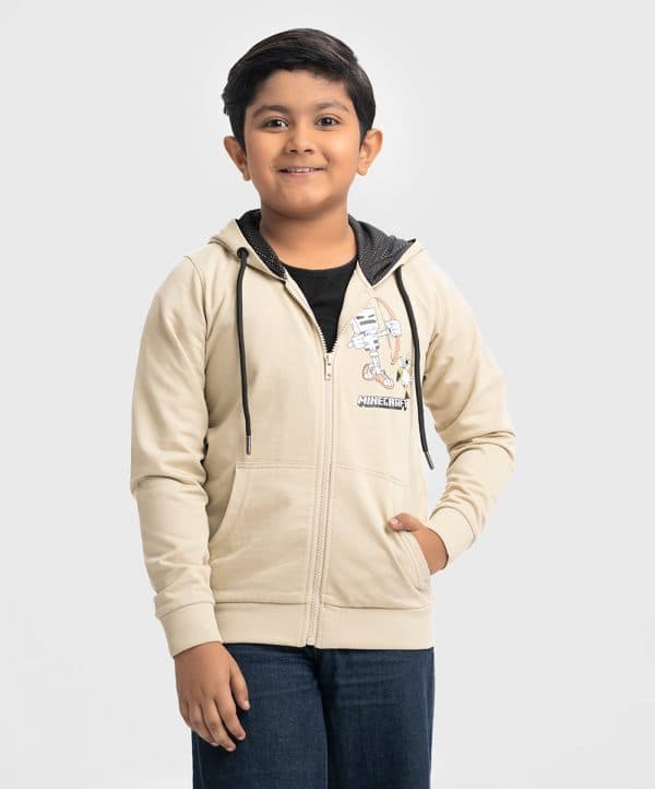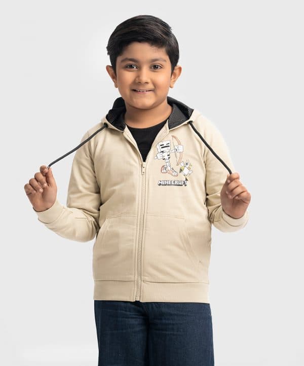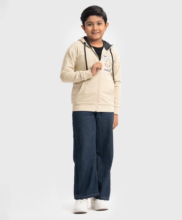 Kid boys round neck hoodie in French terry fabric. Adjustable drawstring at hood. Full sleeves with kangaroo pockets. Zip-up & cartoon print at the front & back.
