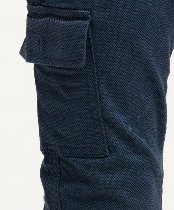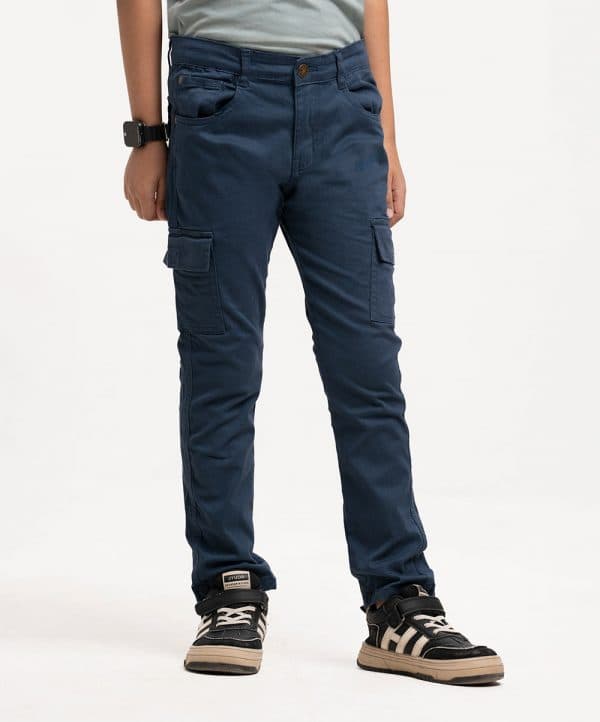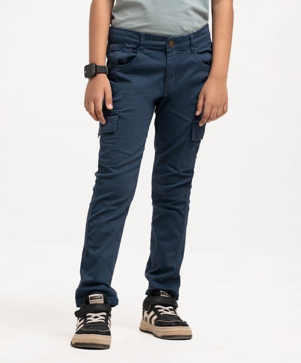 Kid boys’ long woven pant in twill fabric. Features two front pockets, two side cargo-style mobile pockets, a zip fly with a metal button, and two back pockets.