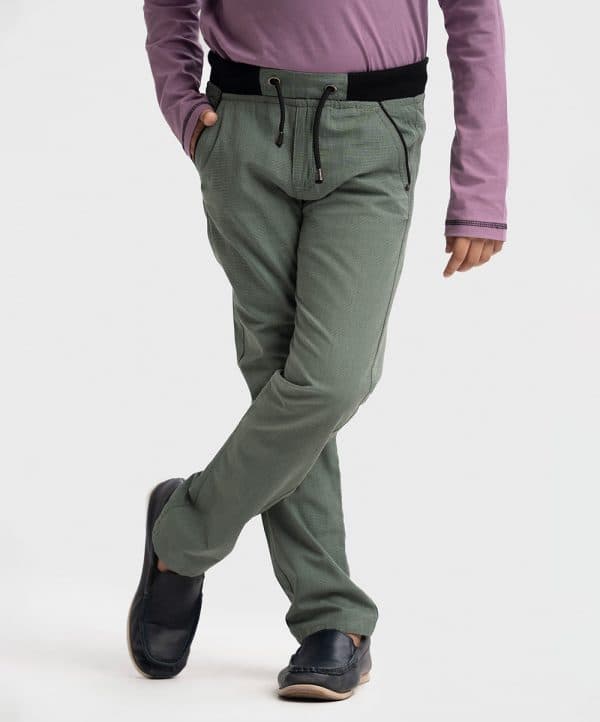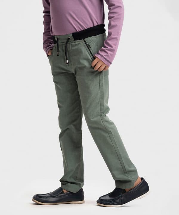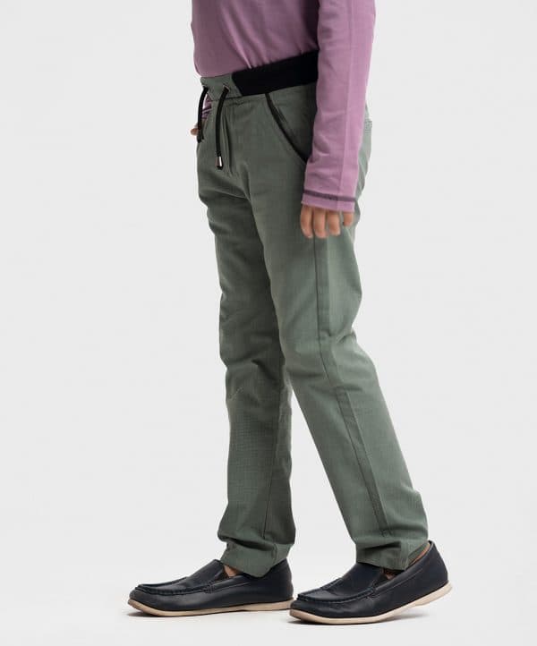 Kid boys long woven pants in cotton-blended fabric. Features two front cross pockets, one coin pocket, and two back pockets. Concealed elasticated waistband cord.