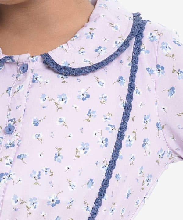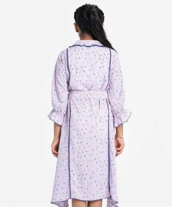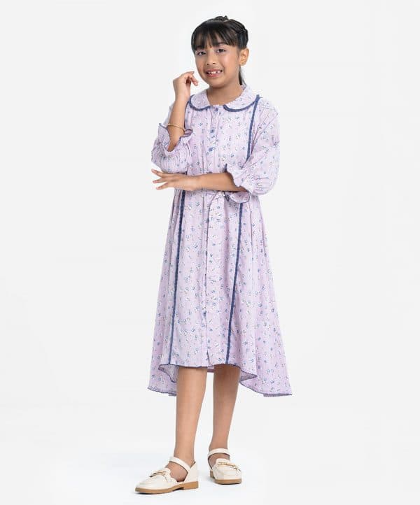 Kid girls frock in floral printed georgette fabric with half-body viscose inner. Lantern sleeved, peter pan collar and elongated hem. Lace work at front with tie-cord waist belt.