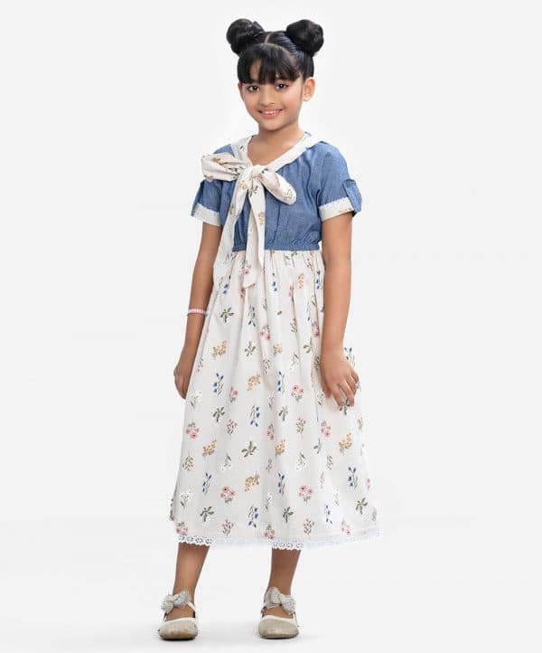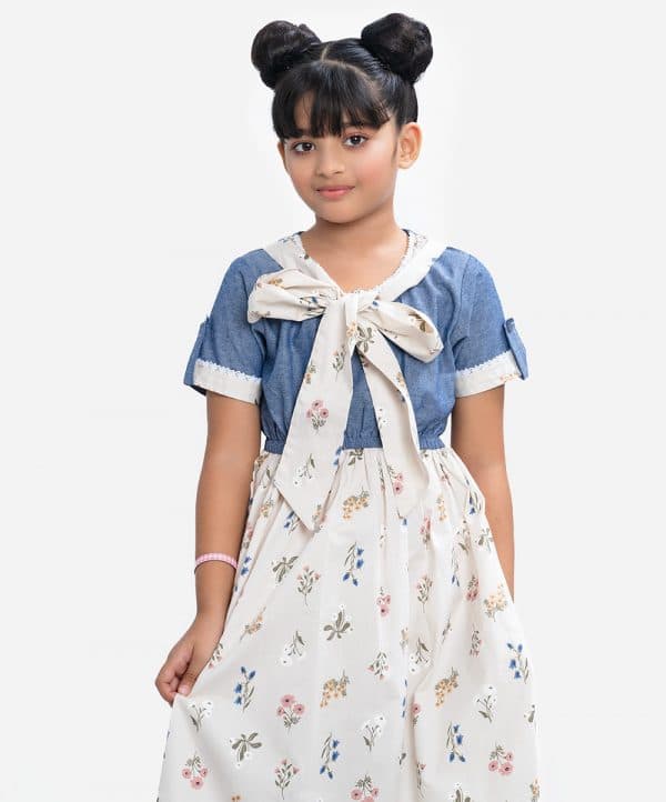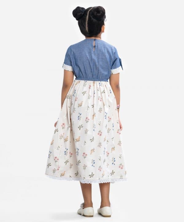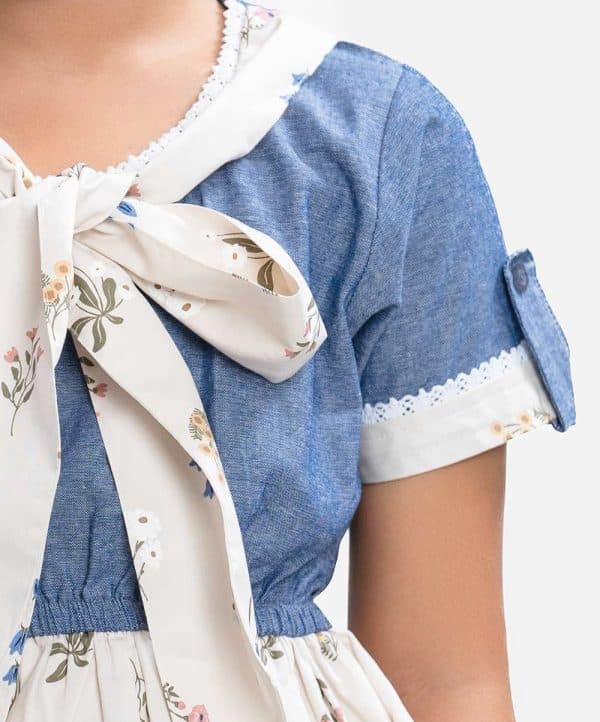 Kid girls A-line frock in printed cotton & chambray fabric. Roll-up short sleeves, round neck with bow-style belt attached. Lace at sleeves, neckline and hemline.