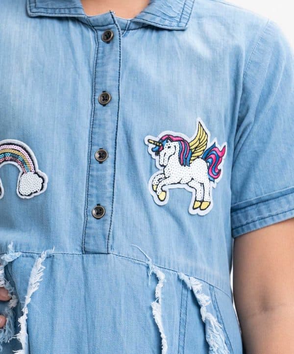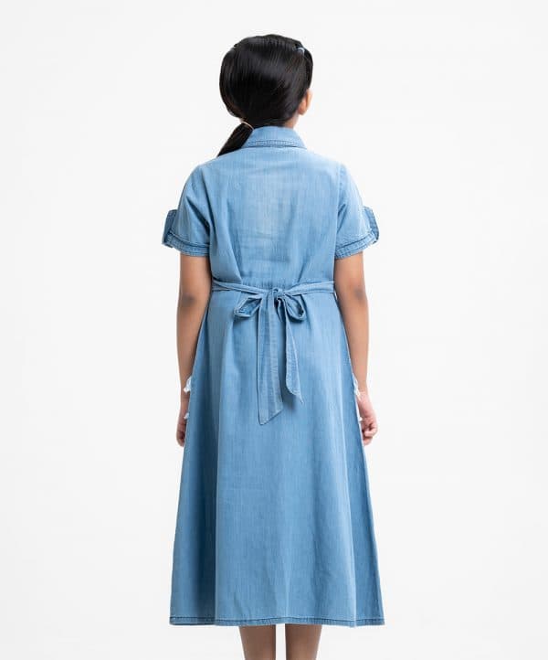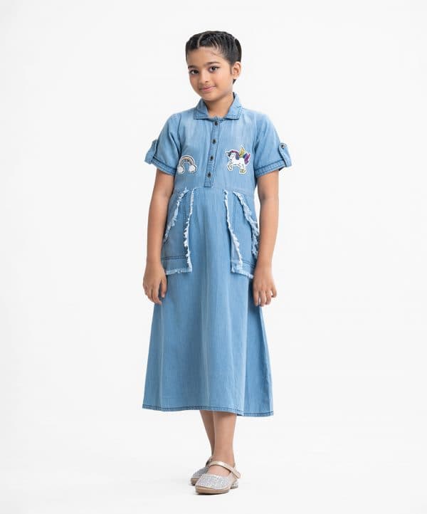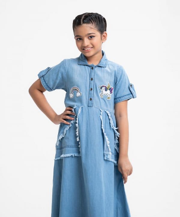 Kid girls A-line frock in denim fabric. Roll-up short sleeves, classic collar. Embroidery sticker attached to the front. Tie-cord at waistline and inseam pockets.