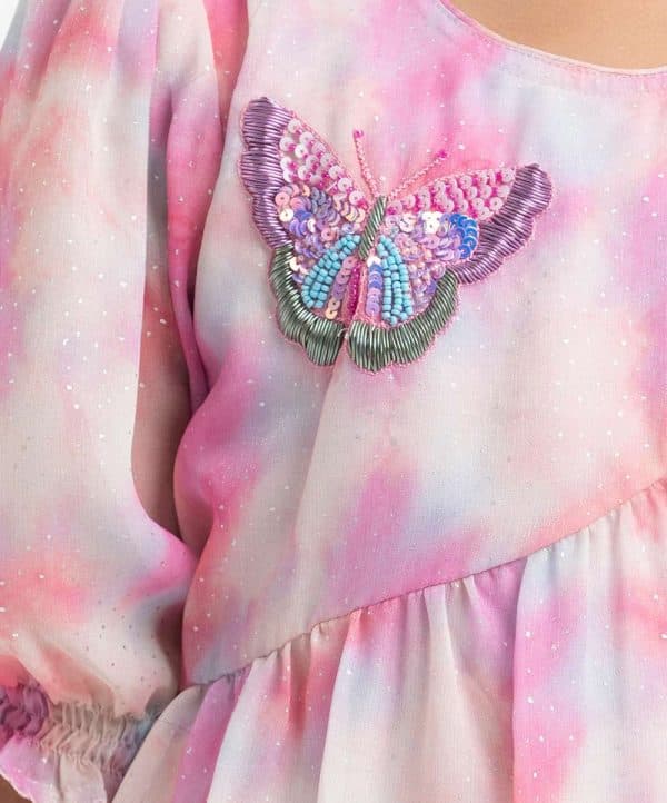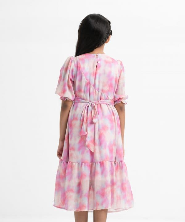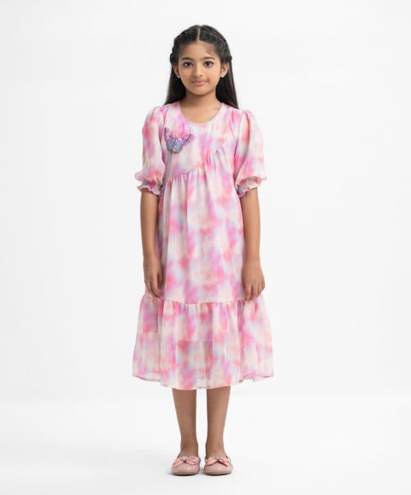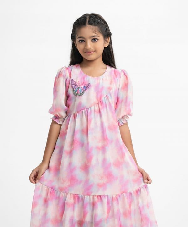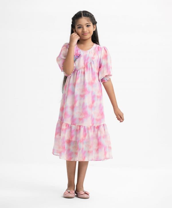 Kid girls’ frock in georgette fabric. Round neck, puff-sleeved. Pattern and karchupi at the front. Waistbelt and frills at the hemline.