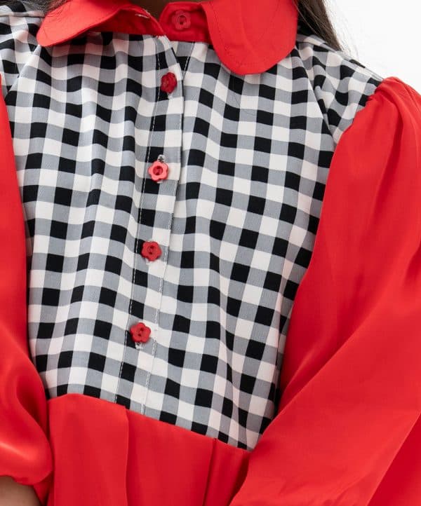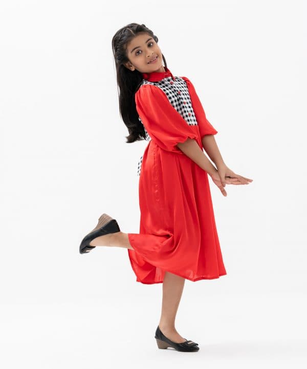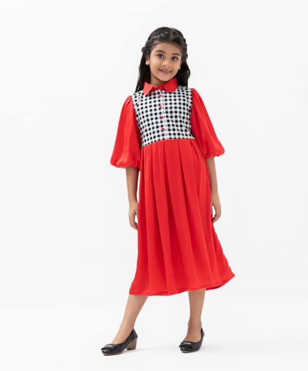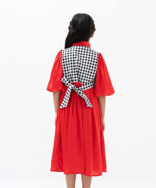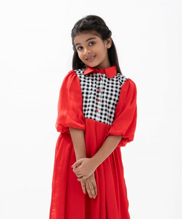 Kid girls frock in art silk fabric with half-body check printed twill fabric. Balloon sleeves, peter pan collar. Box pleated from waistline with tie-cord waist belt.