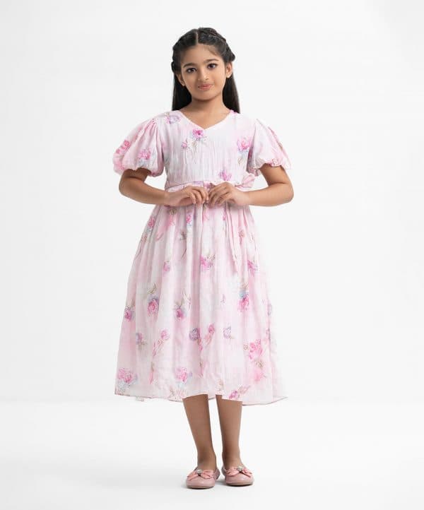 Kid girls fairy tale frock in floral printed georgette sequins fabric with full cotton lining and cancan inner. Balloon sleeves, heart neckline. Bow attached and box pleated at waistline. Zipper closing and criss-cross tie-up back with floral tassels.
