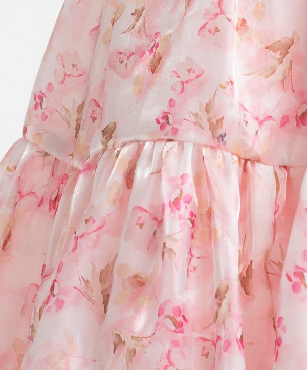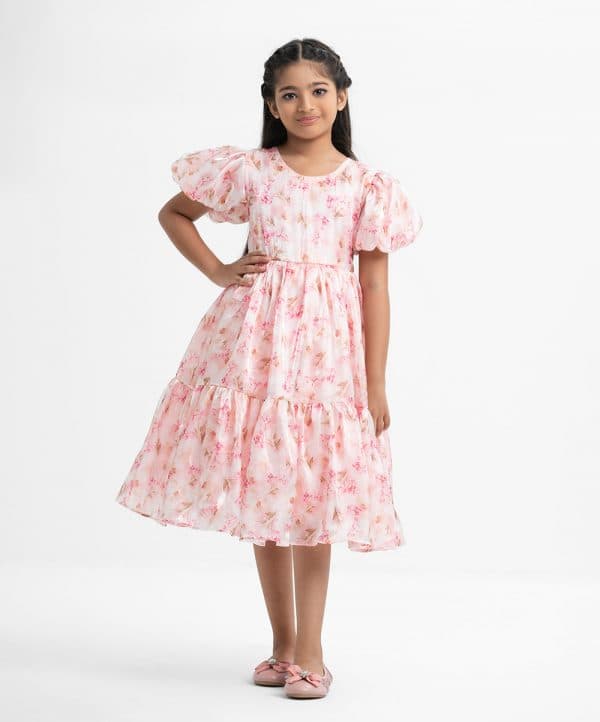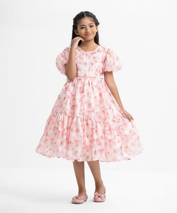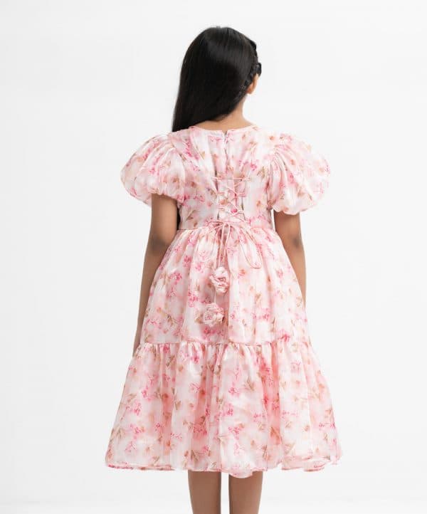 Kid girls fairy tale frock in floral printed organza fabric with full cotton lining and cancan inner. Balloon sleeves, heart neckline. Bow attached and box pleated at waistline. Zipper closing and criss-cross tie-up back with floral tassels.